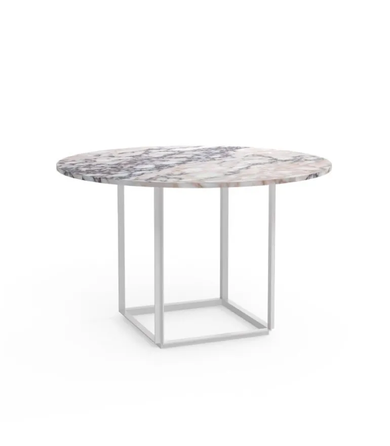 New Works’ Florence dining table consists of a cubic steel frame supporting a round table top in strong-veined Viola marble. The slender and unique Florence makes an excellent dining table in various different interiors from households to cafés and restaurants.
