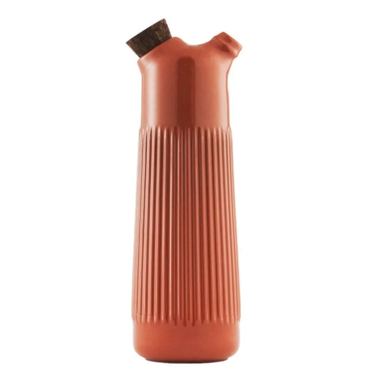 The Junto vinegar bottle, designed by Simon Legald for Normann Copenhagen, was inspired by a traditional Spanish carafe named botijo. Just like traditional botijos, Junto vinegar bottles are made of terracotta clay that gives them a rustic, warm character. Due to the material, the shade of the bottle might also vary slightly, amplifying the hand-made feel of the design: the reddish hue might tend to a warm orange or to a slightly darker brown.
