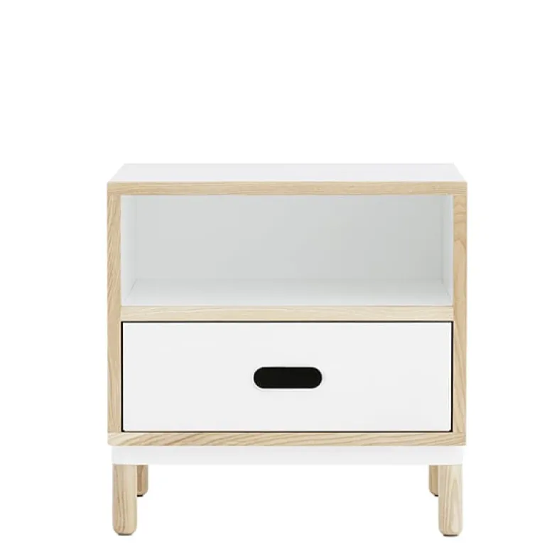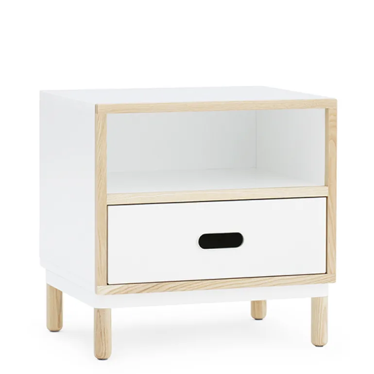 Kabino bedside table by Normann Copenhagen consists of a stylish metal drawer and a small open shelf. Designed by Simon Legald, Kabino storage furniture is characterized by an urban, industrial look that is softened by light, wooden details. Thanks to their simplistic appearance, pieces of the Kabino collection will serve in the office, kitchen as well as the hallway. When the legs are removed, Kabinos can also be stacked on top of each other.