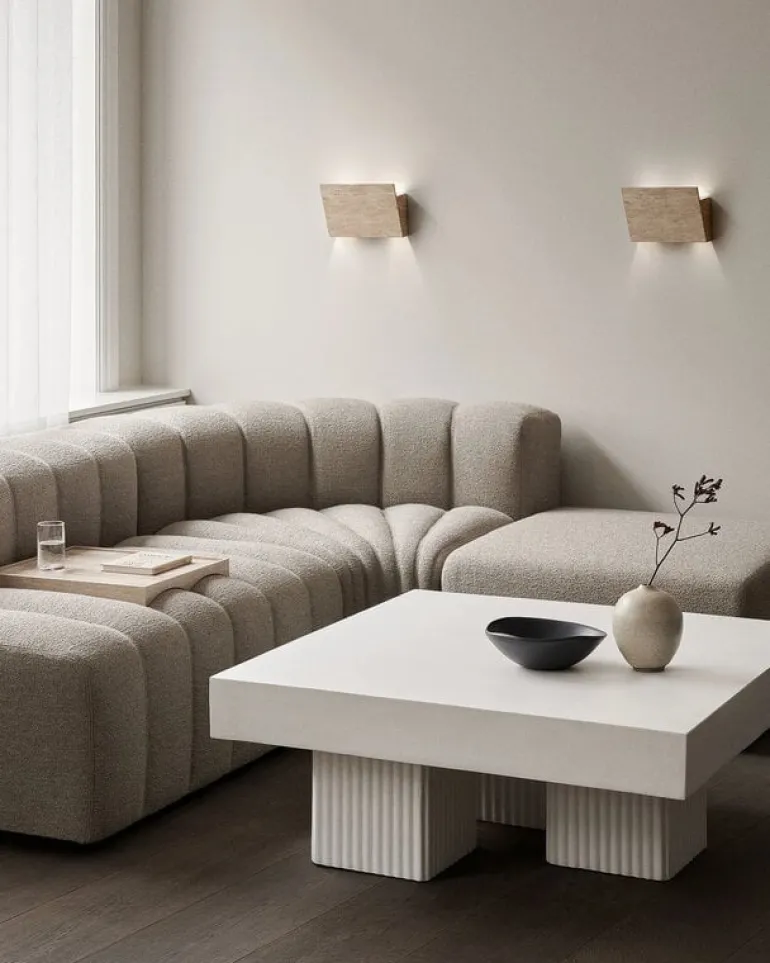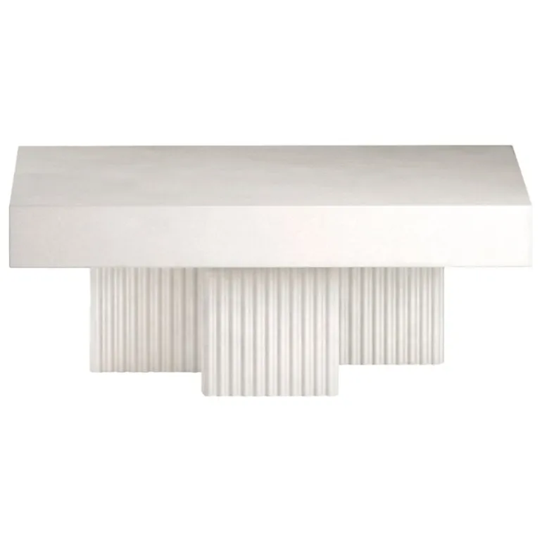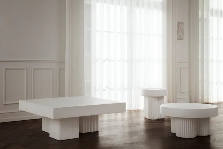 NORR11’s Gear coffee table is a sculptural concrete table with a design inspired by the brutalist architecture of the mid-20th century. The Gear Square coffee table features a sturdy, square-shaped table top supported by three block-like legs, arranged in a slightly asymmetrical configuration. Concrete gives the table a lively, tactile texture, which is emphasized by the fluted details of the legs.