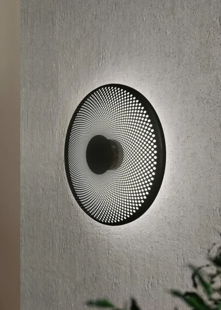 Northern’s Glint wall lamp charms with its soft, intimate light. The delicate luminaire consists of a circular metal shade with a perforated surface that filters a play of lights and shadows across the wall. The Glint light is suitable for many rooms: the slim and elegant luminaire is a delight on its own on a bedroom wall or in a row of lamps in a hallway or staircase.