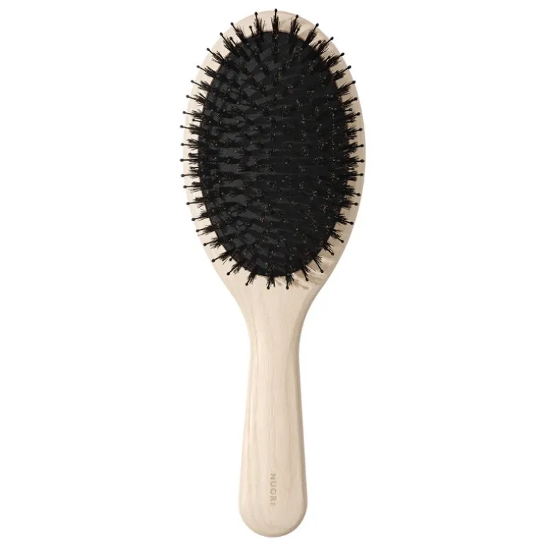 Nuori’s Revitalizing hairbrush brings a touch of quality and elegance to your daily hair care routines. The innovative design of the Revitalizing hairbrush is based on a combination of two types of bristles. The long, rounded nylon bristles detangle the hair gently, massaging and stimulating the scalp, while the shorter natural bristles help to distribute the scalp’s natural oils through the hair for a smooth and frizz-free result. The sturdy handle of the hairbrush is made of ash. The Revitalizing brush comes in an elegant case made of vegan leather.