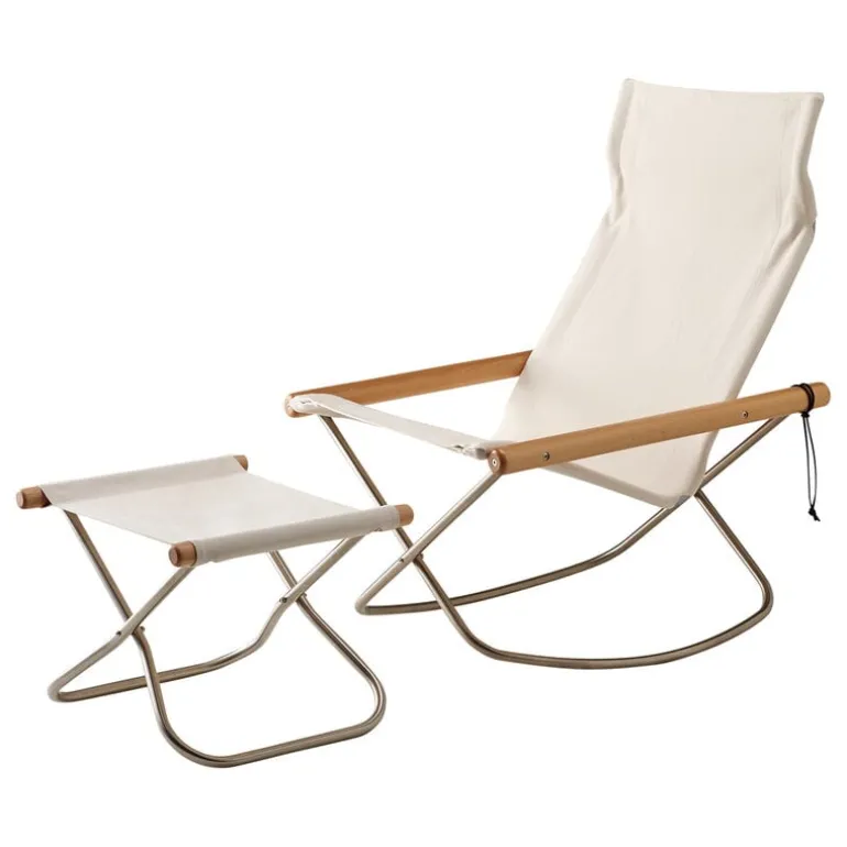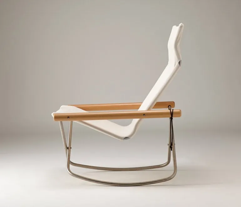 The Nychair X rocking chair is a Japanese design classic that combines a foldable metal frame, a cotton fabric seat and wooden armrests, resulting in an effortlessly light and airy esthetic. This minimalist rocking chair features a low, gently swaying frame that allows for a relaxed lounging position and a high, curving backrest that provides support to the neck. The durable sailcloth molds to the contours of the sitter, and if needed, the entire seat fabric can be cleaned or replaced. With its sleek yet incredibly comfortable design, the Nychair X rocking chair is equally suited for watching TV and unwinding in the living room or taking a well-deserved break in the office, and its foldable structure enables effortless storage and transportation.