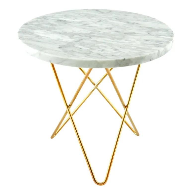 The Mini O Table is a smaller version of the O Table by OX Denmarq. The design is an interesting combination of two different materials: the softly bent brass frame gives the table a light appearance, perfected by the vivid surface of a thick marble top. The look will develop even more unique over time, as the shine of the brass will turn into darker patina. Created by designer Dennis Marquart, the Mini O Table is a perfect choice as a sofa table for a smaller couch, a coffee table for a reading corner or an extra table to other rooms of the house.