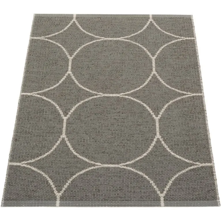 Boo plastic rugs from Pappelina are decorated with large, graphic circles and woven on a traditional loom in Dalarna, Sweden. The rugs are reversible and have an opposite pattern on the other side. Made of phthalate-free PVC ribbon, the rugs are durable and easy to care for, and their stylish two-tone colors suit various decors. Due to its narrow form, the rug can easily be put to use as a stunning hallway runner, kitchen area rug or outdoor rug. The Boo rugs feature welded ends and an embossed Pappelina logo.