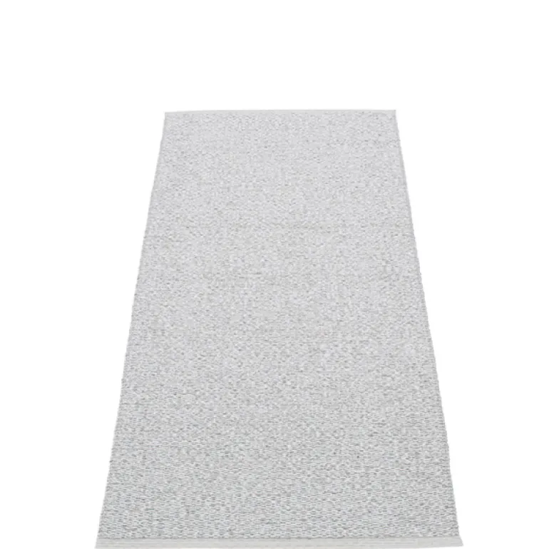 The Svea plastic rugs from Pappelina are woven on a traditional loom in Dalarna, Sweden. Made of phthalate-free PVC ribbon, the rugs are durable and easy to care for, and their two-colored metallic shades are perfect for modern interiors. The Svea rug can easily be put to use as a hallway rug, kitchen area rug or outdoor rug. The Svea rugs come with an embossed logo on both ends.