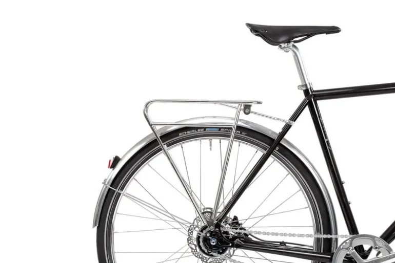 Pelago Bicycles’ Commuter Rear Rack is a sturdy and stylish bike rack equally well-suited for urban riding, commuting as well as bike touring. Made from stainless steel, the rear rack features a slim profile and horizontal mounting rails for side panniers. This design allows for a lower center of gravity, ensuring stability even when carrying heavy loads on the panniers, while still leaving ample space on the top platform. For optimal maneuverability, it’s recommended to pack the heaviest items on the rear rack and as low as possible.