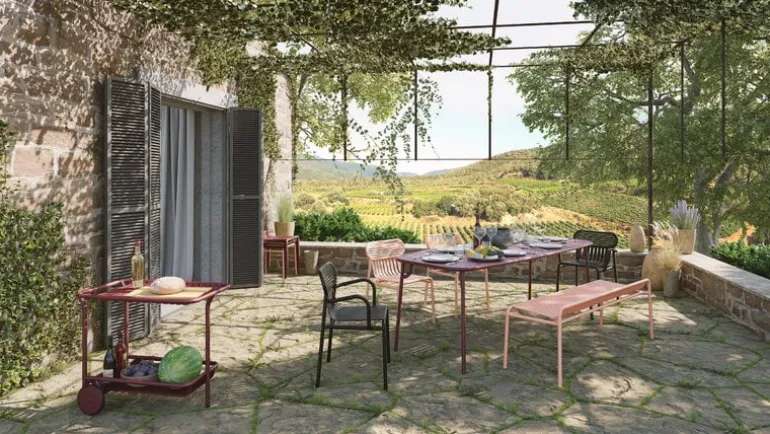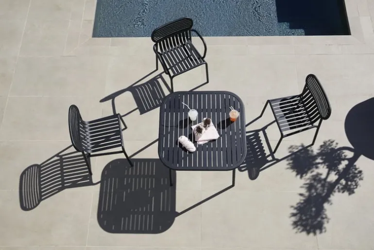 The Week-end bridge chair is part of Petite Friture’s collection of aluminum outdoor furniture. The attractive armchair is characterized by oval shapes and both horizontal and vertical slats on the backrest. All the chairs of the Week-end range are stackable.