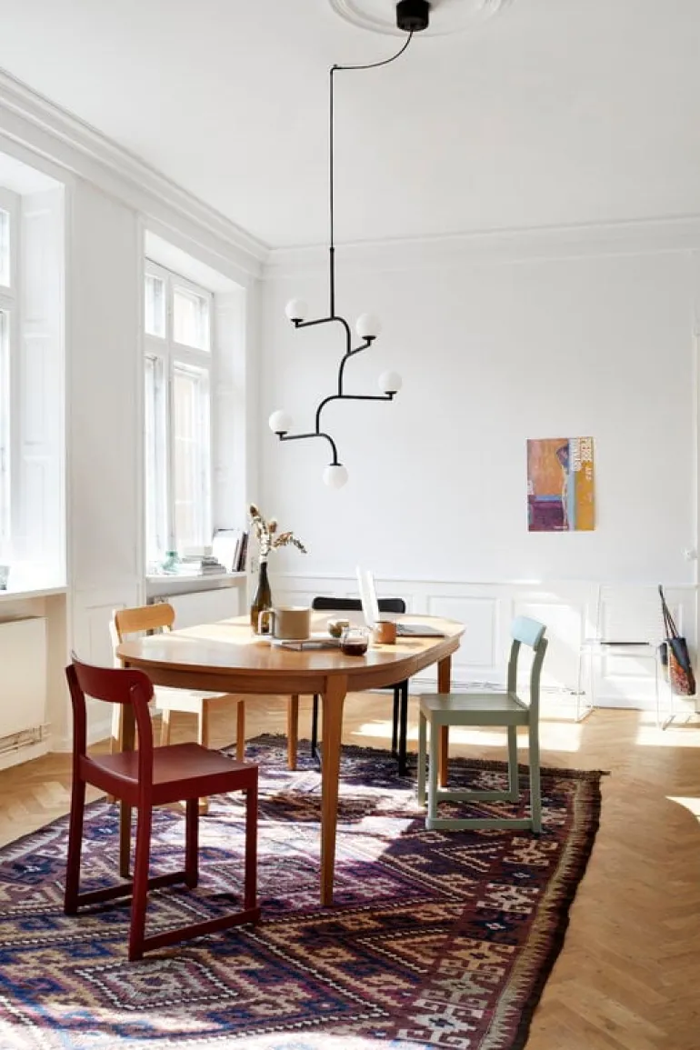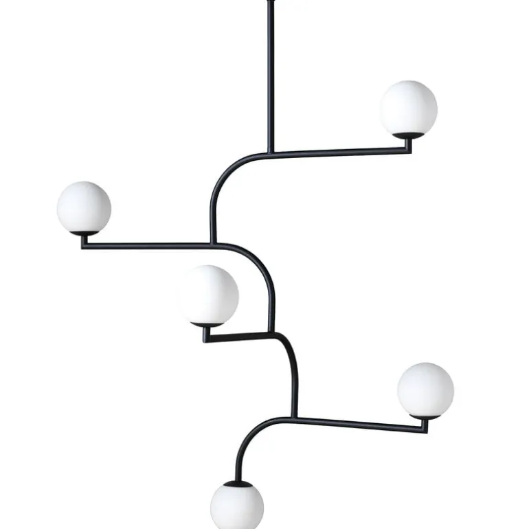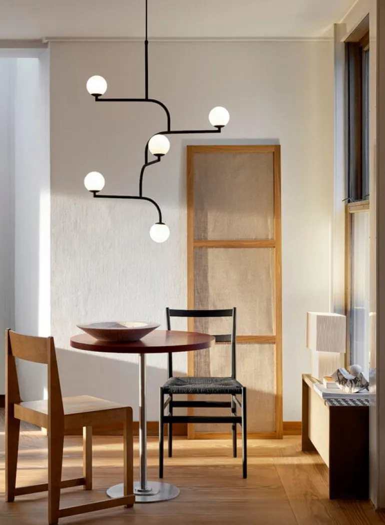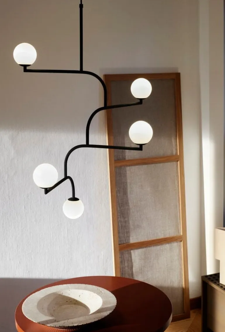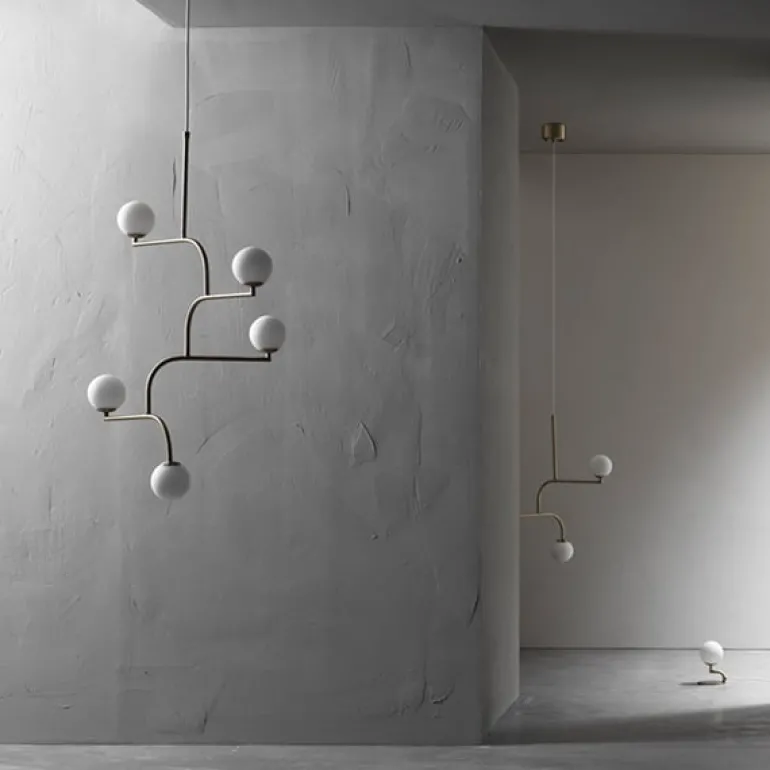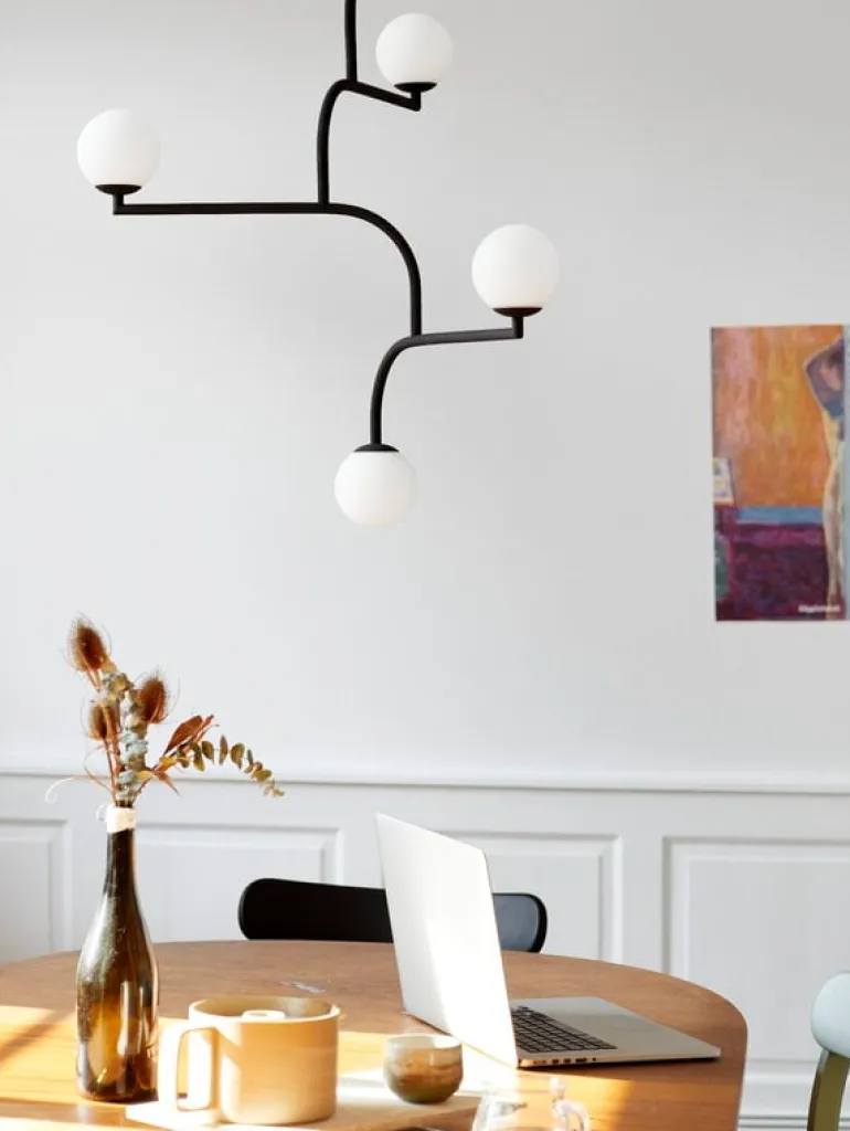 Pholc’s Mobil 100 pendant features five opal glass shades and four identical metal elements that can be turned around to create a desired composition. The elegant pendant is available in three finishes and will catch the eye with its beautiful mobile-like shape in any dining and living room.