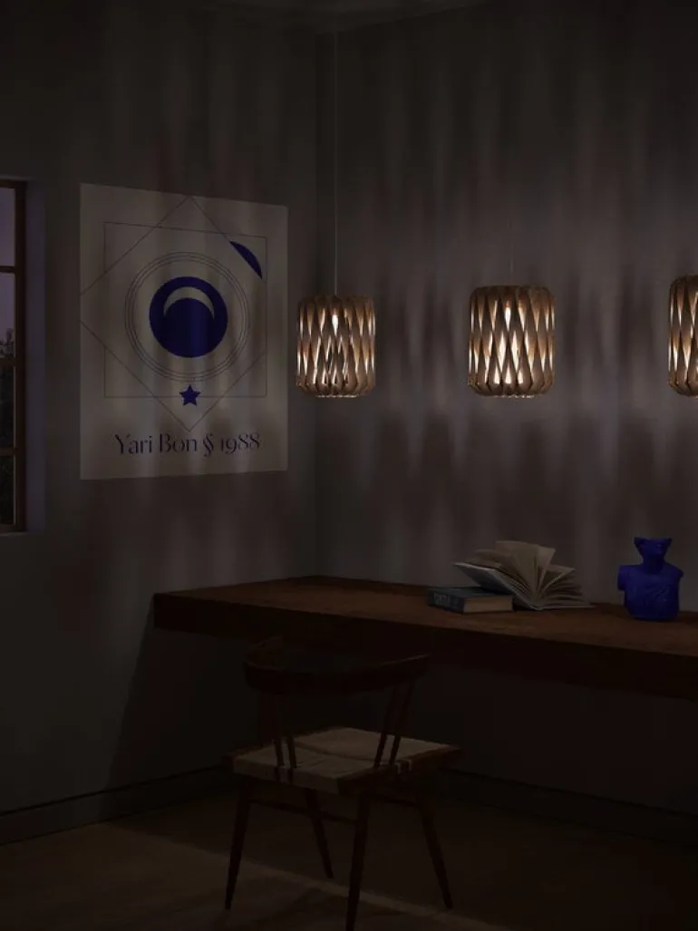 Pilke 18 is part of the simple yet ornamental Pilke Signature Collection designed by Tuukka Halonen. Crafted from birch plywood, the Pilke luminaires are an enchanting combination of technology and tradition: Halonen sought influences for the design from traditional Finnish wood crafts but utilized today’s manufacturing methods and materials. As a contemporary interpretation of shingle work, the lamps are characterized by a crystal-like pattern that filters the light pleasantly and casts beautiful shadows on the walls and ceiling. All Pilke lamps are designed and handcrafted in Finland.