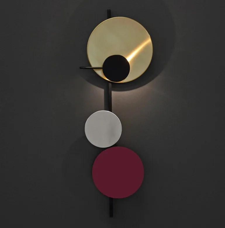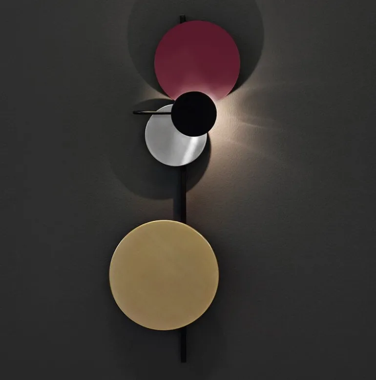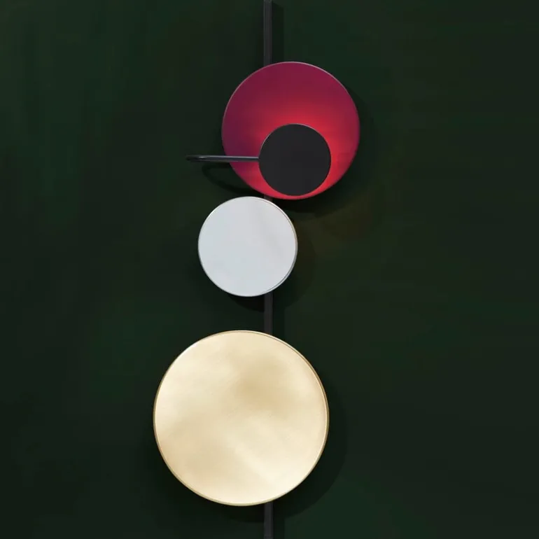 Planet lamp, designed by Mette Schelde for PLEASE WAIT to be SEATED, has a fascinating, interactive design. The wall light consists of a slim frame and three differently sized disks reminiscent of planets. Made of brass, aluminum and powder-coated steel, the disks reflect light and cast shadows in their own unique way. The appearance of the Planet lamp can be easily altered since the planets are attached to the frame with magnets. With the ambient Planet lamp, you may create your own domestic solar systems with orbits and eclipses.