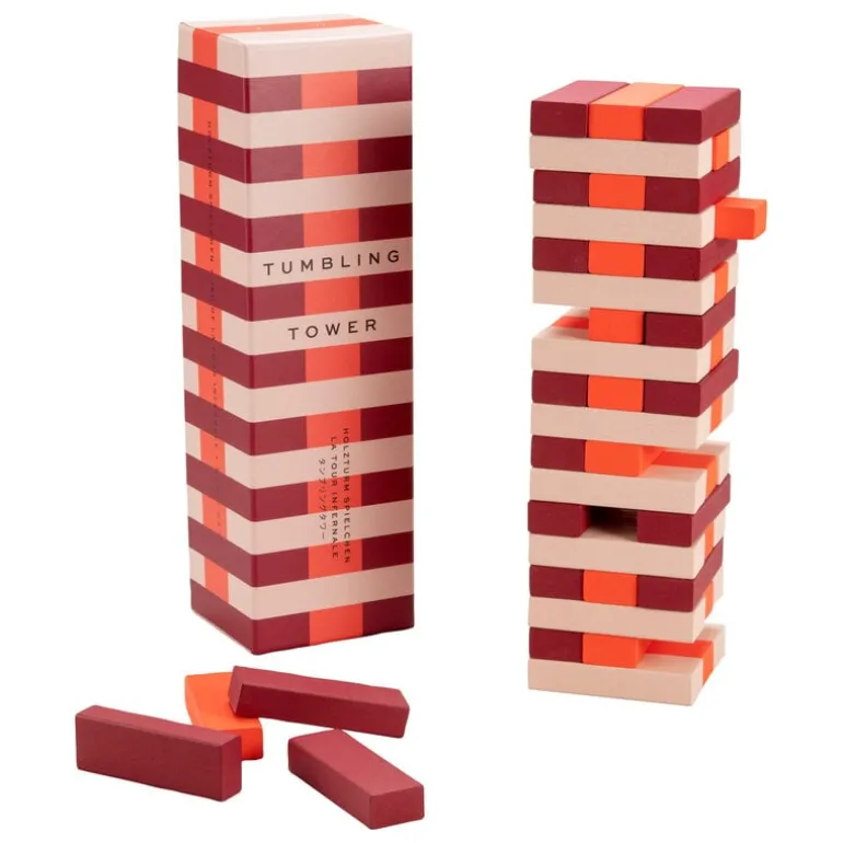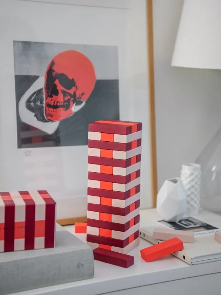 Printworks’ Tumbling Tower game offers a delightfully colorful interpretation of the classic game. Made of red-colored wooden pieces, the game is easy and fun to play: players simply aim to build the tower higher and higher – but at some point, the top is reached, and it’s tumbling!