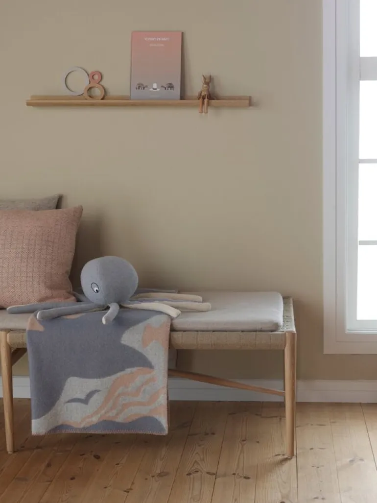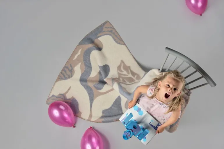 Røros Tweed’s Fugl og fisk blanket features an abstract landscape where natural elements and animals blend together – the name translates from Norwegian to “bird and fish”. Designed by Sandra Blikås and inspired by the works of surrealist M. C. Escher, this throw plays with the harmony of different textures and shapes, mirrored on the reverse side in contrasting colors. With its soft, gentle tones, this wool blanket is perfect for brightening up your bedding or as a cozy throw for the sofa.