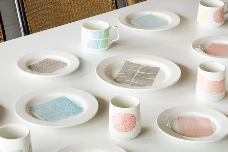 Sabato’s ceramic tableware is made in Japan, specifically in Hasami, Nagasaki Prefecture, an area renowned for its centuries-old porcelain-making tradition. Designed by the Drill Design studio, the collection includes both solid-color and patterned pieces, with graphic, nature-inspired designs based on the work of Japanese-Swiss artist Aoi Huber Kono.