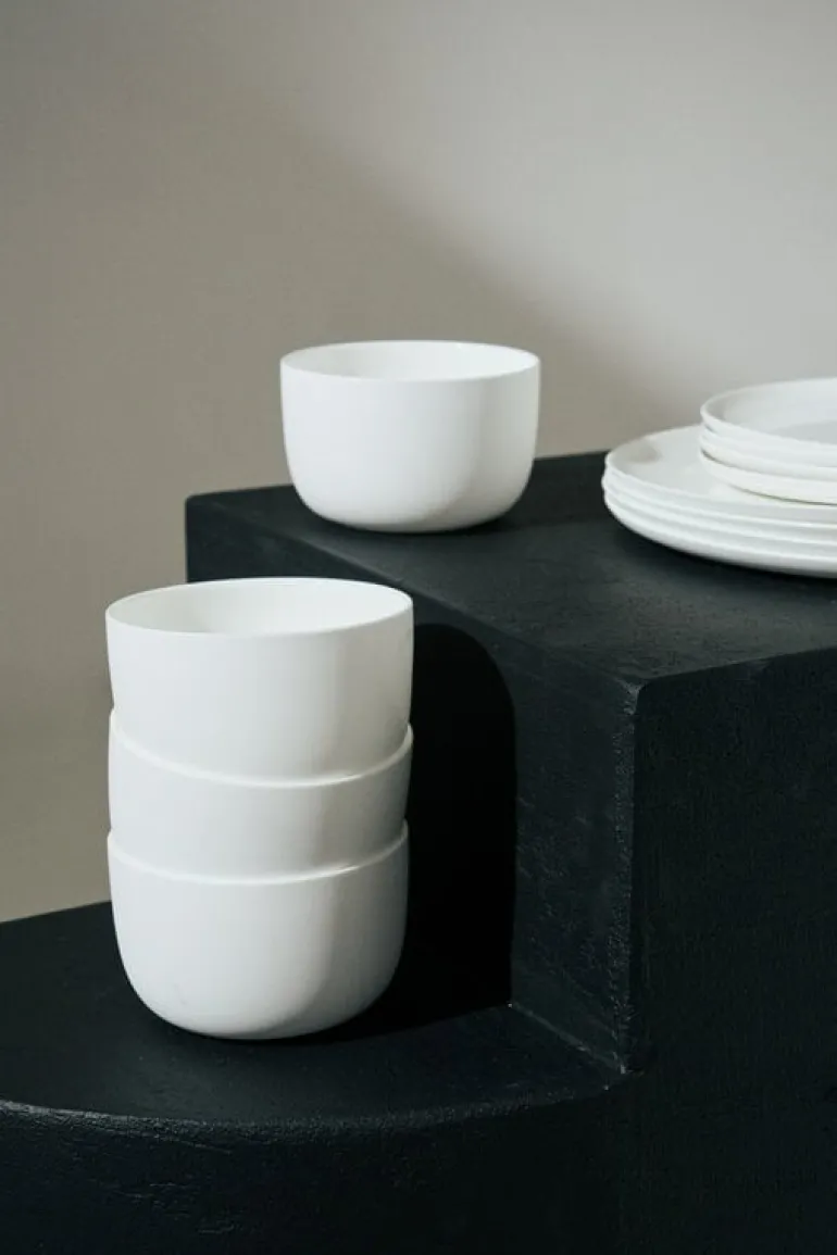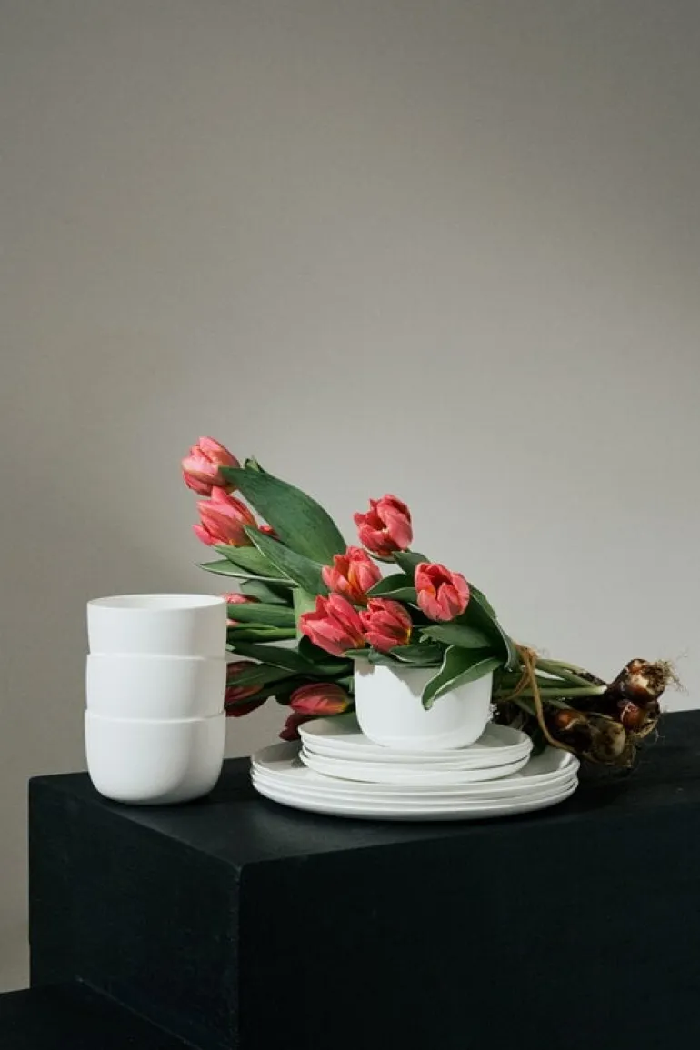 The Base set is part of a dinnerware and cutlery collection designed by Piet Boon, featuring simple, functional shapes with a calm and sophisticated feel. Crafted from white porcelain, the plates provide an elegant setting for even the finest meals, while their sturdy, rimmed design ensures they serve just as well for everyday dining.