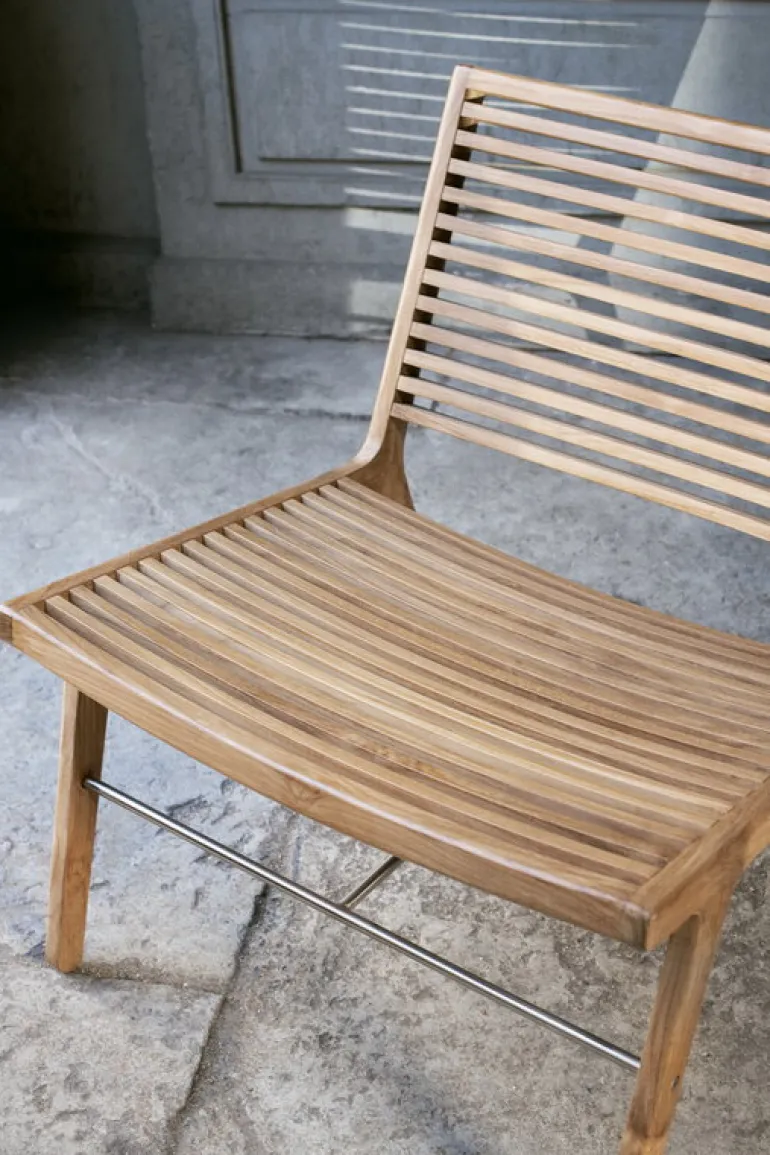 The RIB lounge chair is made of high-quality, untreated teak. Over time and use, the chair will become even more distinctive: teak is a classic outdoor material that ages beautifully, developing a lovely patina and turning into a sophisticated silvery gray tone. However, those who like the authentic golden shade more need not be worried, as the original color can be retained by treating the furniture with a suitable teak sealant.