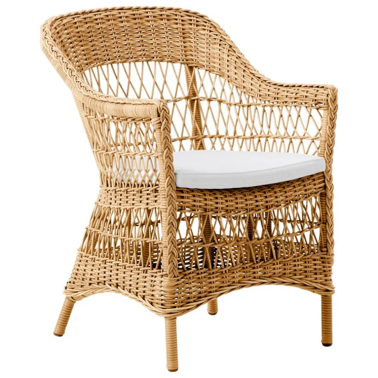 Sika-Design’s Charlot chair is an outdoor dining chair boasting a high backrest with a simple, airy weave made from synthetic rattan. The seat cushions are designed for outdoor use and feature removable, machine-washable covers.
