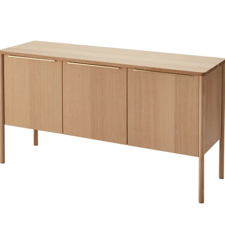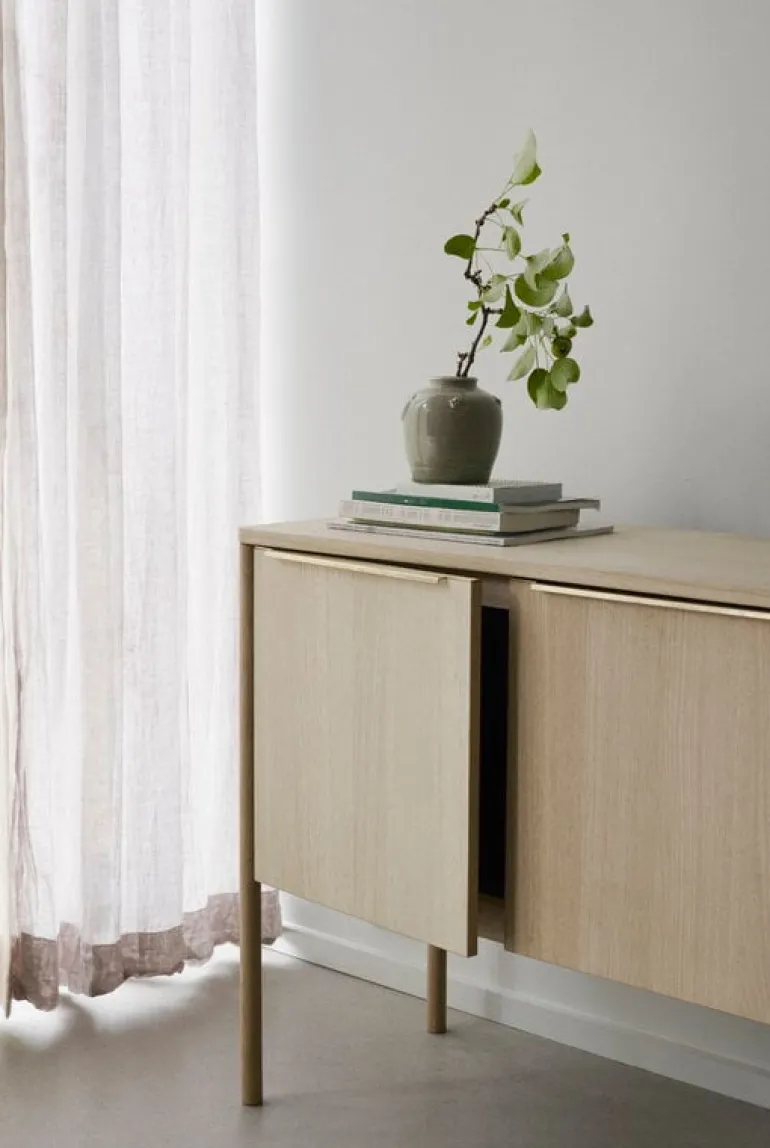 Designed by Thomas Jenkins for Skagerak, Jut is a sophisticated cabinet for storing tableware, clothes, office supplies, and other necessities. The frame is crafted from oiled oak, and the handles are in brass. The space behind the right and mid doors is divided by a removable shelf, and the room behind the left door has been left empty. The combination of luxurious materials and smart design makes Jut both a practical storage cabinet and an eye-catching design object.