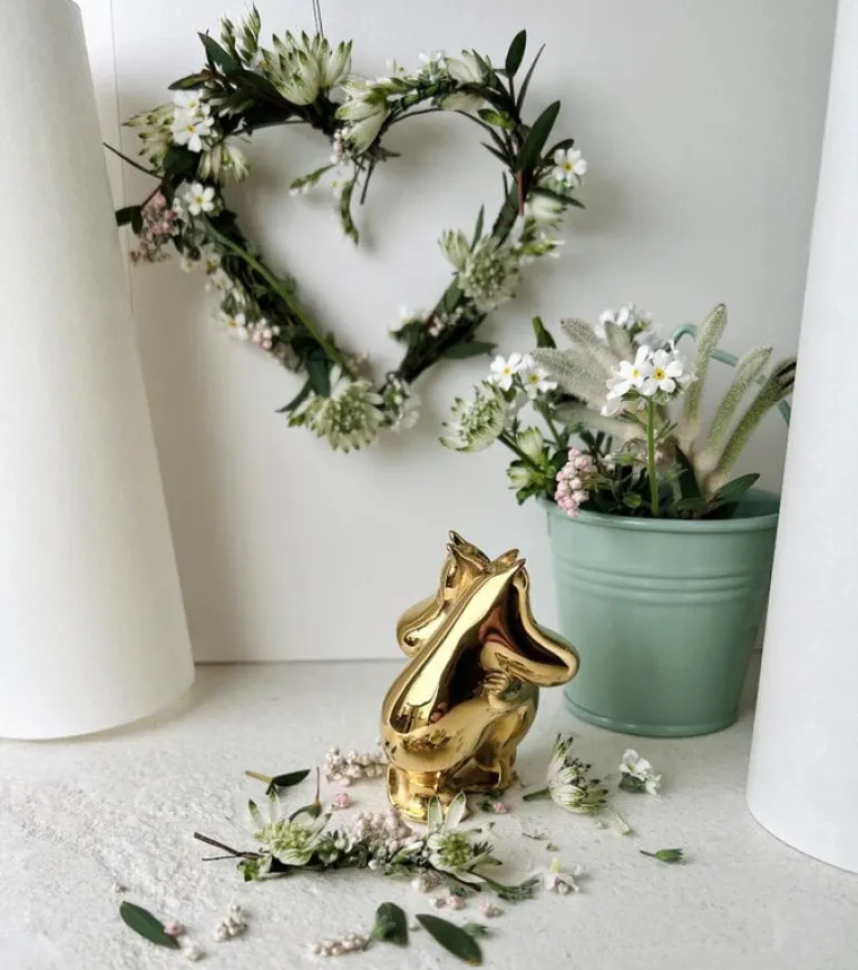Skultuna’s Moomintroll & Snorkmaiden figurine is part of the Moomin x Skultuna collection. Tove Jansson’s most beloved Moomin characters have been given an elegant golden glow: the small sculptures are made of steel and plated with genuine 18-carat gold. The high-quality materials and luxurious finish make the figures timeless and durable – they bring a dose of playful elegance to everyday life, both in the children’s room and in other rooms of the home. Brighten up your desktop with your favorite characters or decorate your bookshelf with the entire Moomin Family! The embracing characters also make a great wedding or engagement gift or a present for your own significant other.