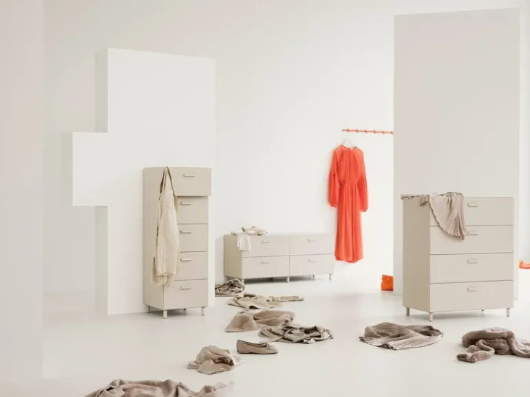 TAF Studio designed the Relief collection to answer the never-ending quest for clothing storage – how to keep your clothes in perfect order without taking up too much space. The pieces in the Relief series are perfectly proportioned for storing clothes and accessories, yet their simple and robust forms adapt to various tasks, from storing kitchen essentials to tidying up toys. The racks and drawers of the series not only complement each other esthetically but also share identical widths, ensuring a seamless fit in both form and function.