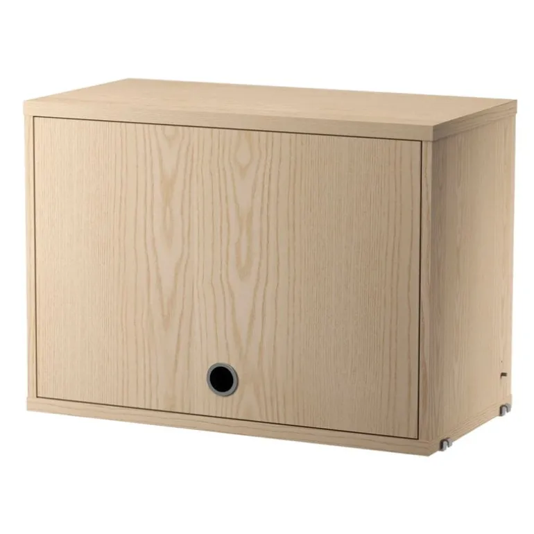The String cabinet with a flip door complements the String shelving system in an elegant and practical manner. Suitable for all 11.81 in (30 cm) deep String panels, the cabinet features an upward-opening door and one adjustable shelf. This versatile flip-door cabinet is equally adept at organizing tableware in the kitchen or neatly storing accessories and clothes in the hallway.