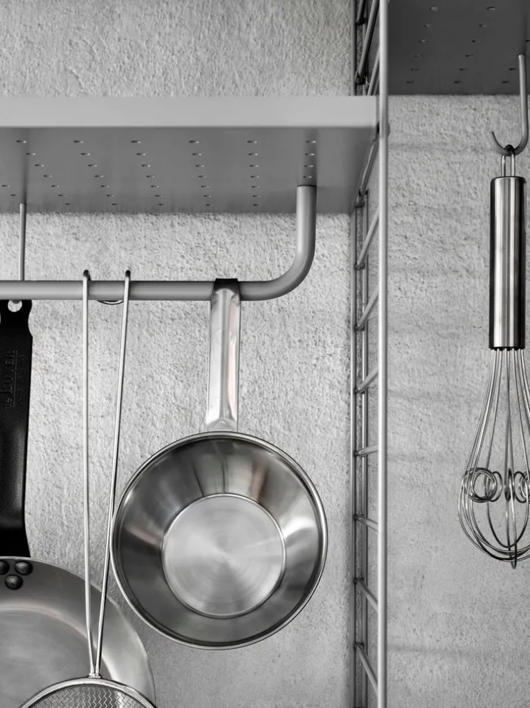 The low String metal shelf is designed to fit String panels measuring 11.81 in (30 cm) in width. Upgrade the shelf with String System’s clever hooks or metal rods for extra hanging storage.