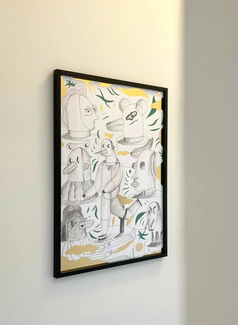The Wrong Shop’s Animalotèque poster by designer Jaime Hayón features surreal, hand-drawn characters whose playful appearance combines both human and animal forms. The poster’s delicate pencil lines are balanced by bold, bright green brush strokes and embossed gold foil details.