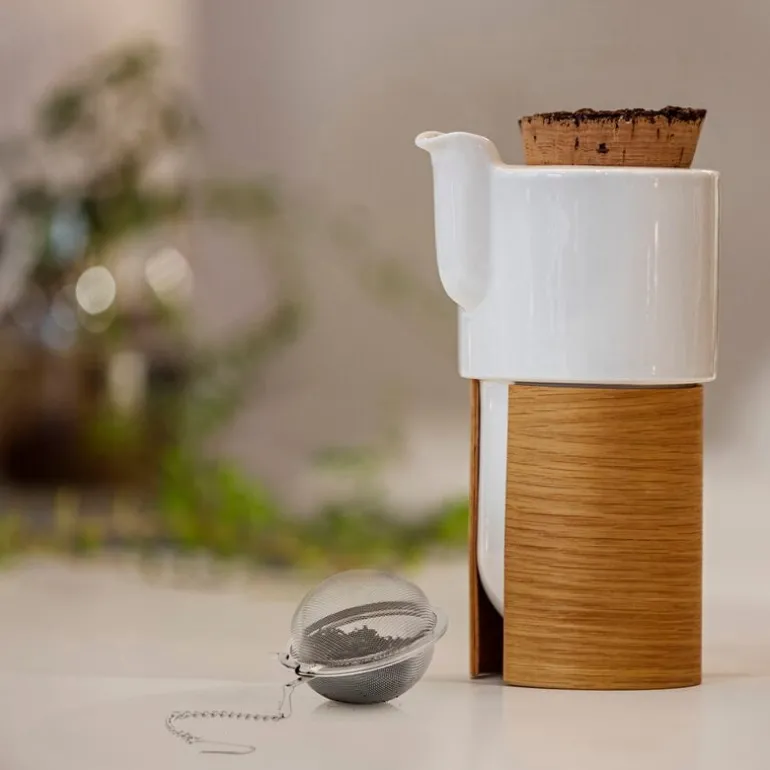 The 20.29 fl oz (6 dl) teapot from Tonfisk Design’s Warm collection enchants with a smooth combination of porcelain and wood. The white porcelain teapot comes with an oak sleeve, natural cork and metal strainer. The porcelain pot is dishwasher safe, and the removable wooden sleeve can be wiped with a damp cloth and oiled from time to time.