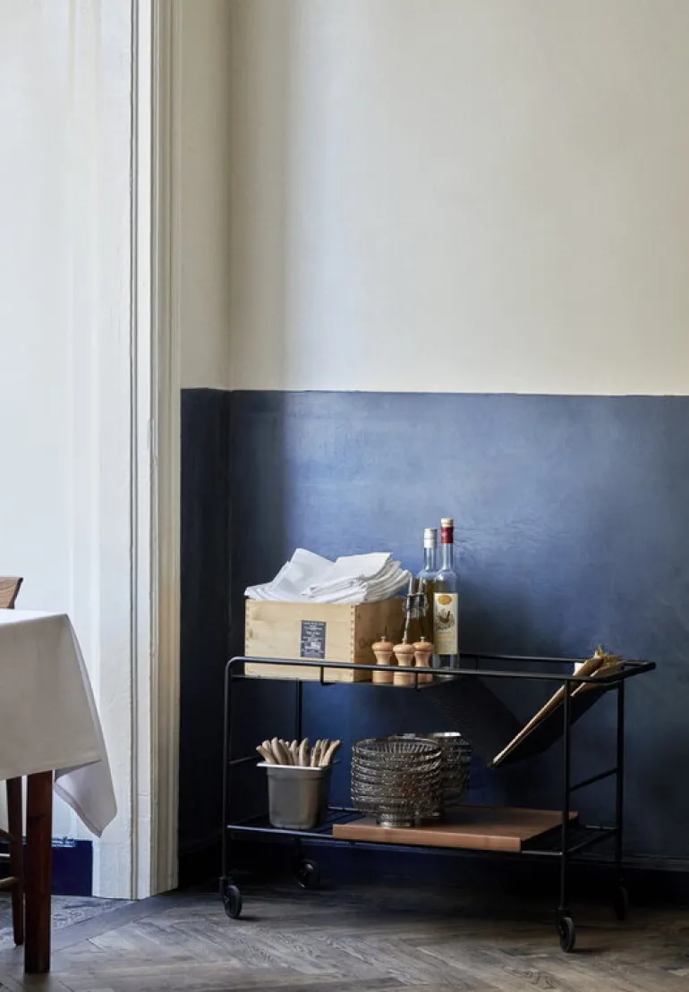 &Tradition’s Alima NDS1 trolley is a streamlined and multifunctional portable storage unit that serves equally well in office use or as a serving trolley. The Alima trolley features a low-maintenance steel frame with a removable wooden tray and a leather-braided handle adding a warm contrast to the design.