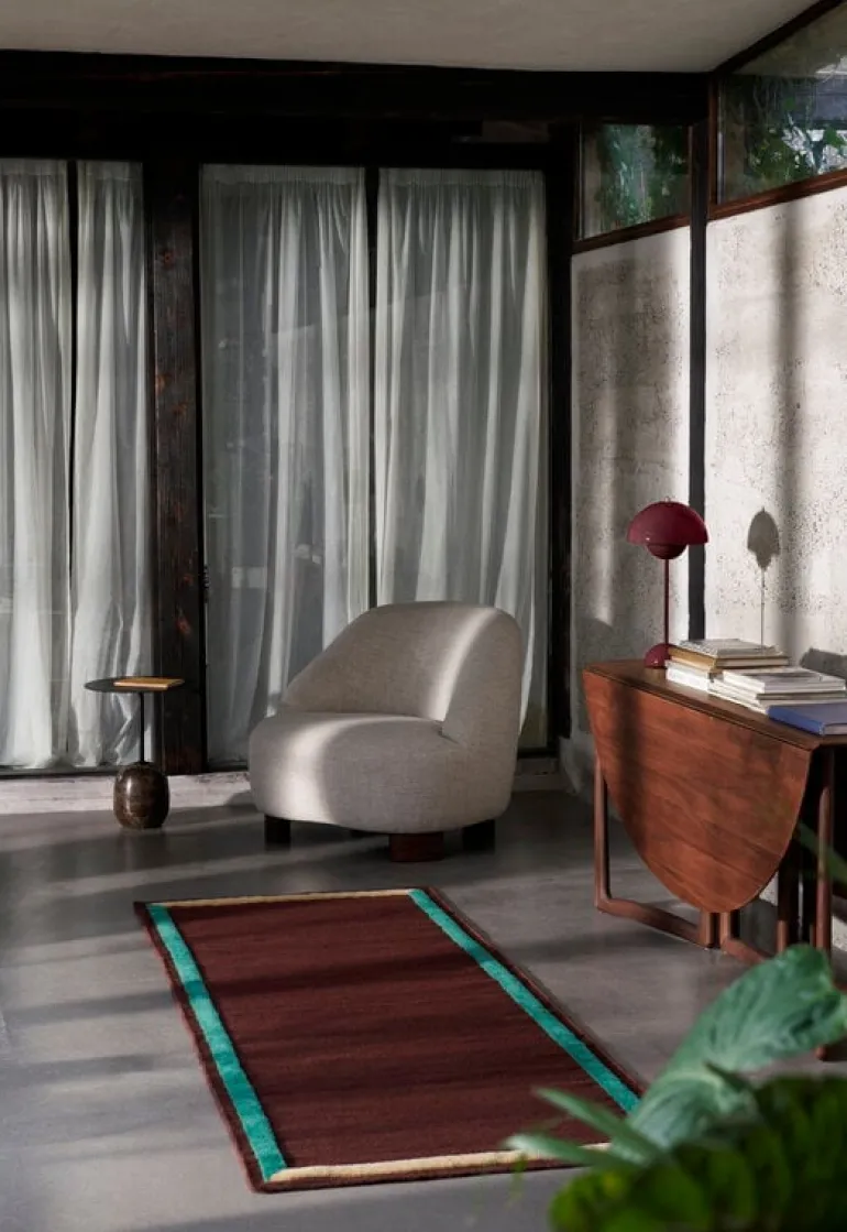 &Tradition’s Framed AP14 wool rug is made using a combination of two different weaving techniques: the flat surface texture is similar to traditional kilim rugs, and the embossed colorful details are woven by hand. The soft, multi-colored pattern of the Framed rug helps to create a dynamic, framed area, while the monochrome kilim surface balances the whole.