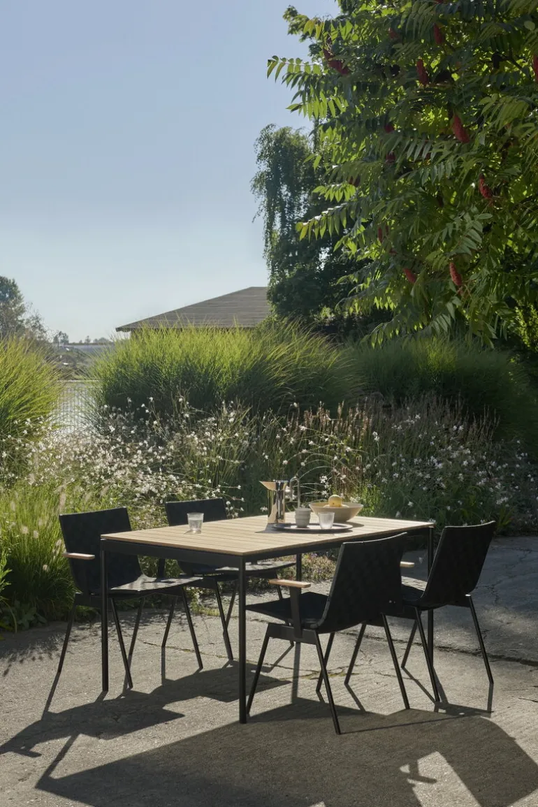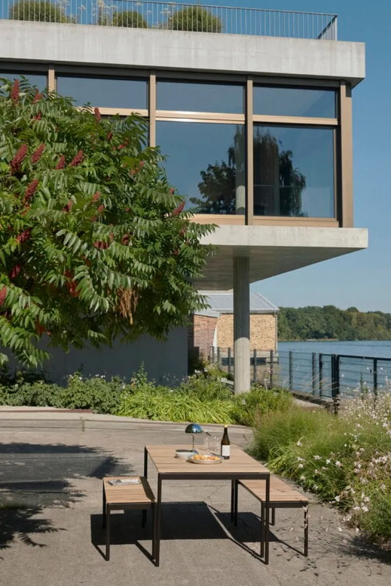 &Tradition’s Ville AV25 table pairs the sturdiness of a teak top with the sleek lines of a steel frame, striking a balance between natural elegance and minimalist strength. The teak lends an organic grace to the Ville patio table, while the steel frame adds a touch of crisp, graphic robustness. You can either let the teak gracefully patinate to a silvery hue or keep its warm color alive with regular oiling. For a complete set, consider pairing the Ville table with matching benches or chairs from the same series.