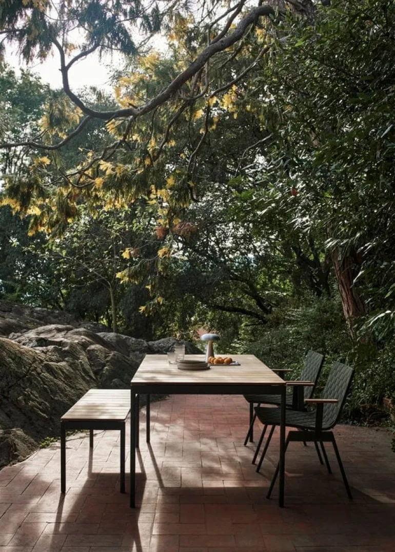 &Tradition’s Ville AV26 table pairs the sturdiness of a teak top with the sleek lines of a steel frame, striking a balance between natural elegance and minimalist strength. The teak lends an organic grace to the Ville patio table, while the steel frame adds a touch of crisp, graphic robustness. You can either let the teak gracefully patinate to a silvery hue or keep its warm color alive with regular oiling. For a complete set, consider pairing the Ville table with matching benches or chairs from the same series.