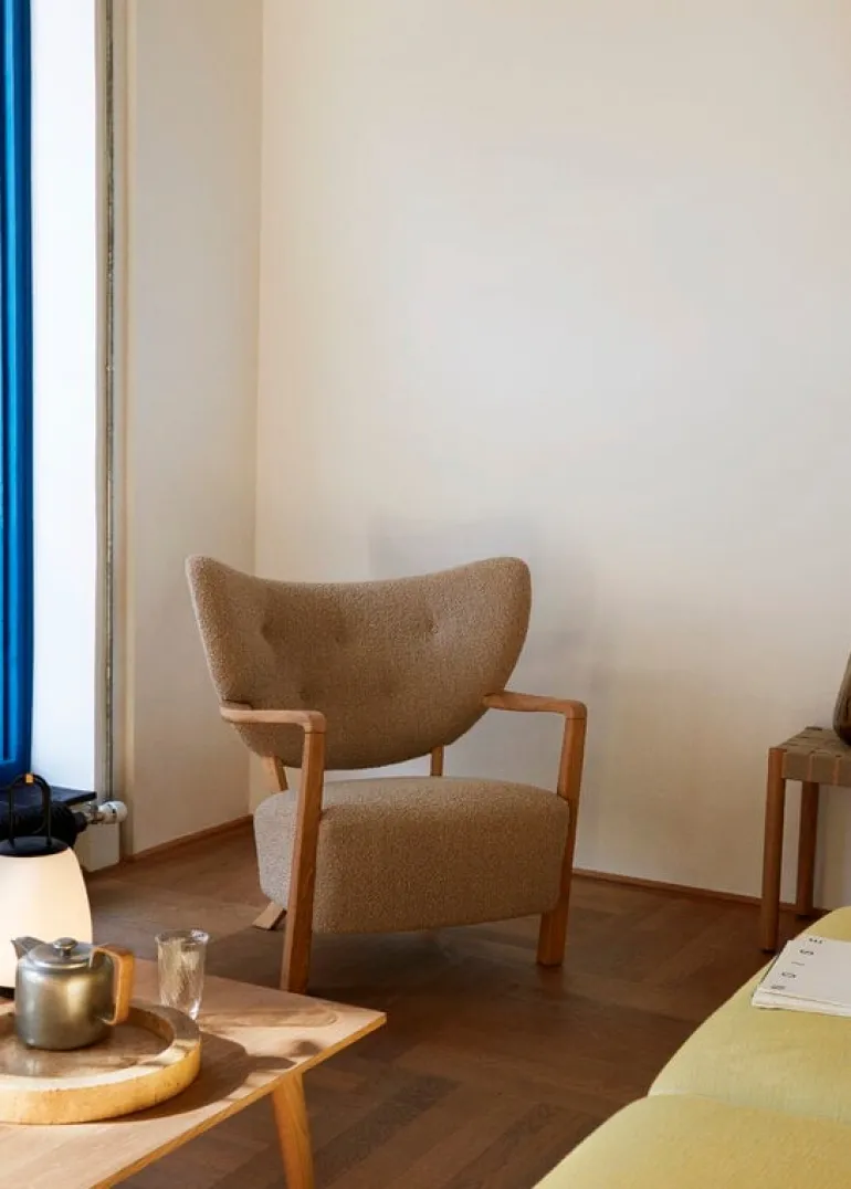 The Wulff lounge chair is &Tradition’s tribute to the elegant, architectural designs of the 1930s. Upholstered in durable bouclé fabric, the lounge chair consists of a softly curved backrest and a luxuriously plush seat, both carried by a ’30s-style wooden frame. The stylish seat makes a gorgeous addition to any space whether in a bedroom, a reading nook, or a living room sitting area.