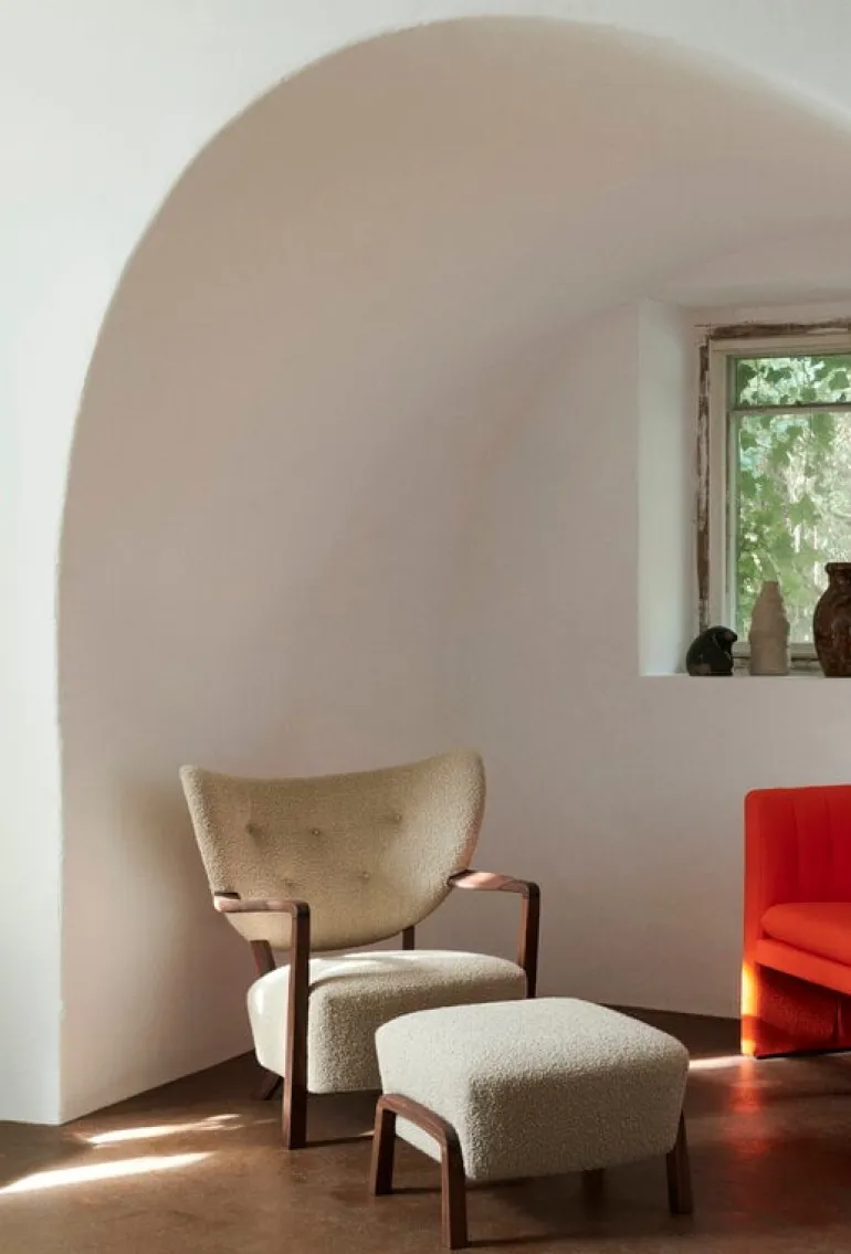 The Wulff lounge chair is &Tradition’s tribute to the elegant, architectural designs of the 1930s. Upholstered in durable bouclé fabric, the lounge chair consists of a softly curved backrest and a luxuriously plush seat, both carried by a ‘30s-style wooden frame. The stylish seat makes a gorgeous addition to any space whether in a bedroom, a reading nook, or a living room sitting area.
