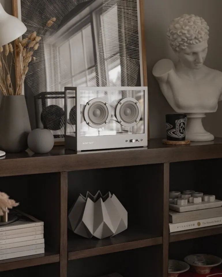Don’t let its size fool you – the Transparent Small Transparent Speaker may be small, but it packs a serious punch! Thanks to Transparent’s unique sound technology, the compact speaker delivers exceptional audio quality along with a surprisingly sculptural design. Made from tempered glass and aluminum, the transparent, minimalist design blends seamlessly with any room and décor.