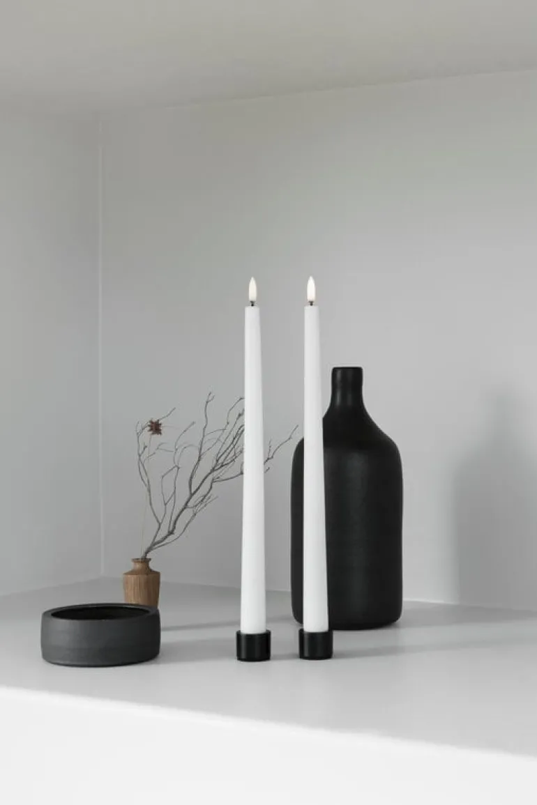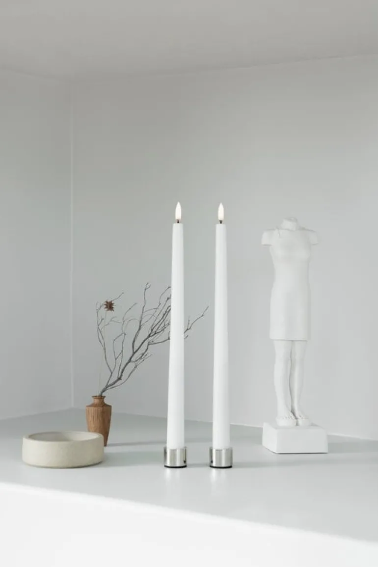 Uyuni Lighting’s LED taper candles are a safe way to create a warm and inviting atmosphere in your home – the kind that can only be achieved with the gentle flicker of a burning candle. The LED candles look deceptively authentic: they are coated with real candle wax and equipped with Uyuni’s patented 3D flame that mimics the fluttering of a regular candle, glowing softly in a warm white tone.