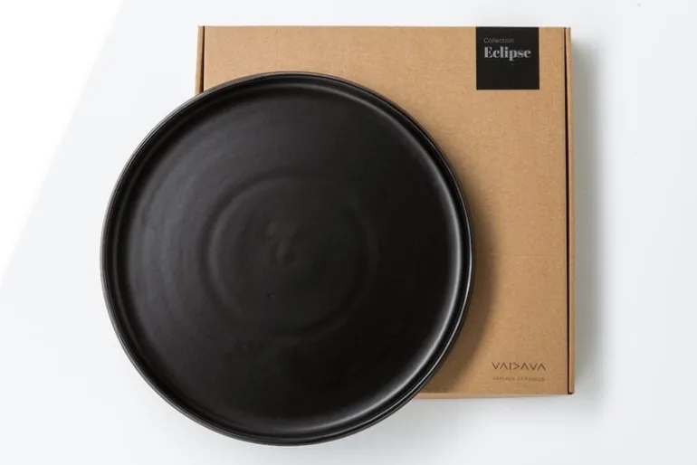 The Eclipse dinner plate is part of a tableware collection designed by Laima Grigone for the Latvian Vaidava. The ceramic Eclipse tableware is made using Terra Sigillata technique that was developed in ancient Rome, and the inside is finished with a lead-free glaze. Characterized by clean, smooth lines and deep black color, the Eclipse range creates a stunning table setting either by itself or paired with tableware of other colors and shapes.