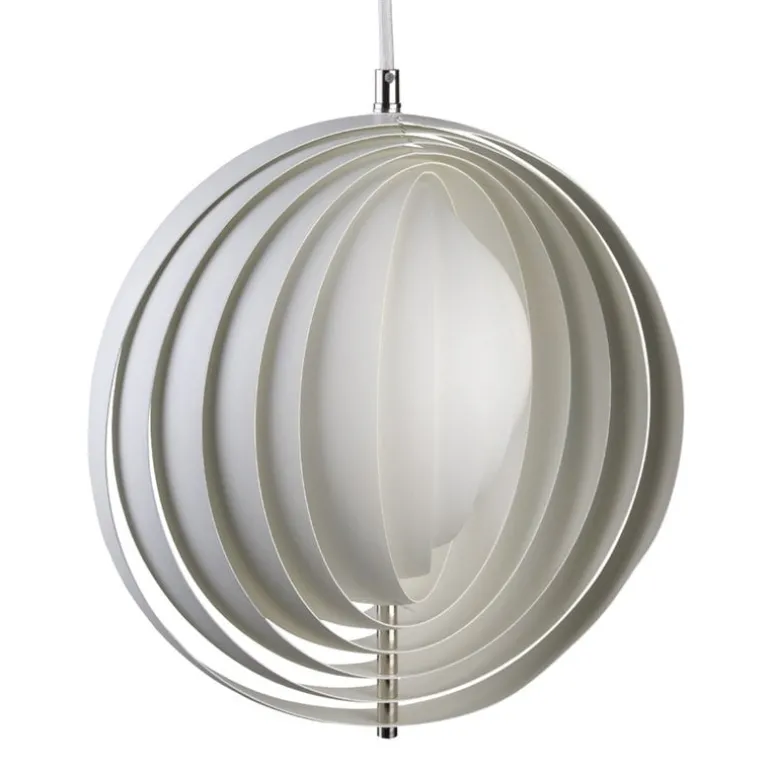 Designed by Verner Panton in 1960 and today manufactured by Verpan, Moon pendant is a stunning example of Danish lighting design of the 1960s. Inspired by the phases of the Moon, the pendant light consists of nested steel lamellae that open like a fan, reflecting soft and white light. By adjusting the steel rings into different positions, you can play with the phases of the Moon. The distinctive luminaire catches the eye for instance above the dining table or in the living room.