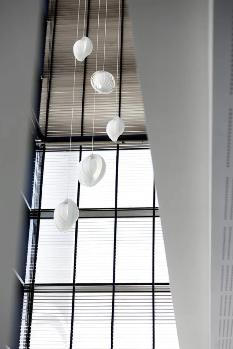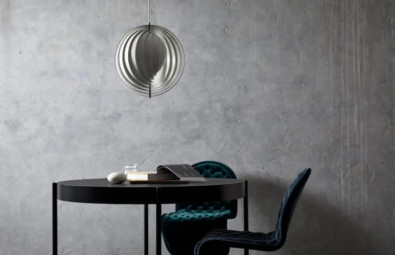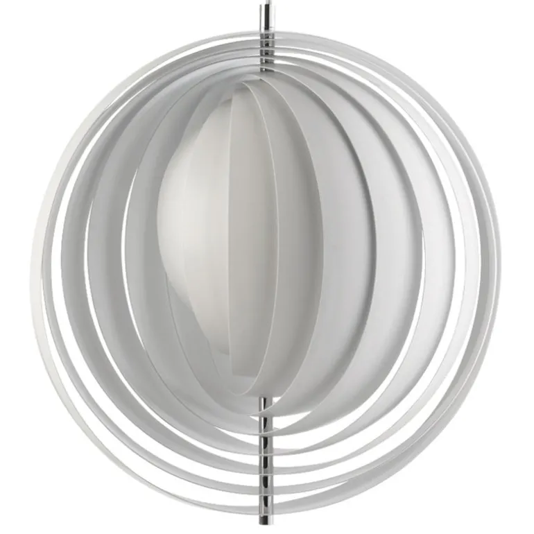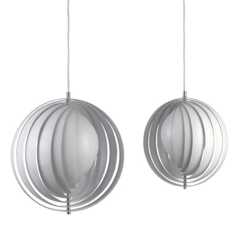 Designed by Verner Panton in 1960 and today manufactured by Verpan, Moon pendant is a stunning example of Danish lighting design of the 1960s. Inspired by the phases of the Moon, the pendant light consists of nested steel lamellae that open like a fan, reflecting soft and white light. By adjusting the steel rings into different positions, you can play with the phases of the Moon. The distinctive luminaire catches the eye for instance above the dining table or in the living room.