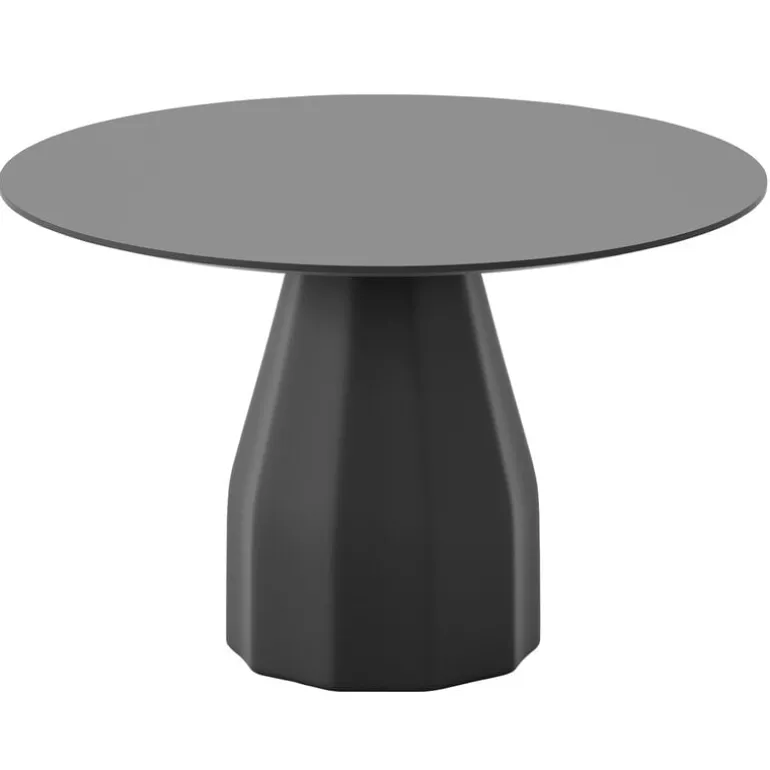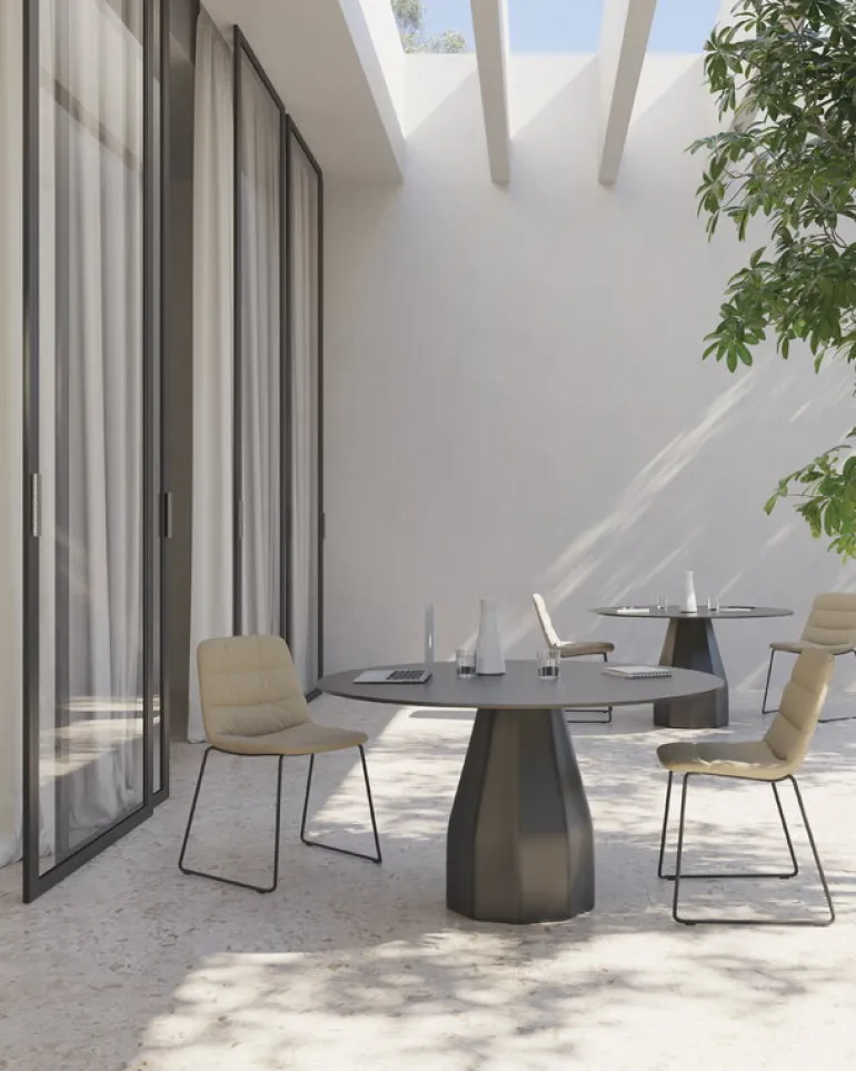 Viccarbe’s Burin table is a sculptural, distinctive piece of furniture designed by Patricia Urquiola. The most recognizable element of the Burin table is its sturdy, polygonal central base. Made from weatherproof compact laminate, the thin tabletop balances the appearance of the bold base, making Burin a perfect dining table for many types of interiors and styles. The Burin series, released in 2011, was inspired by traditional woodcarving methods as well as Spanish design traditions.