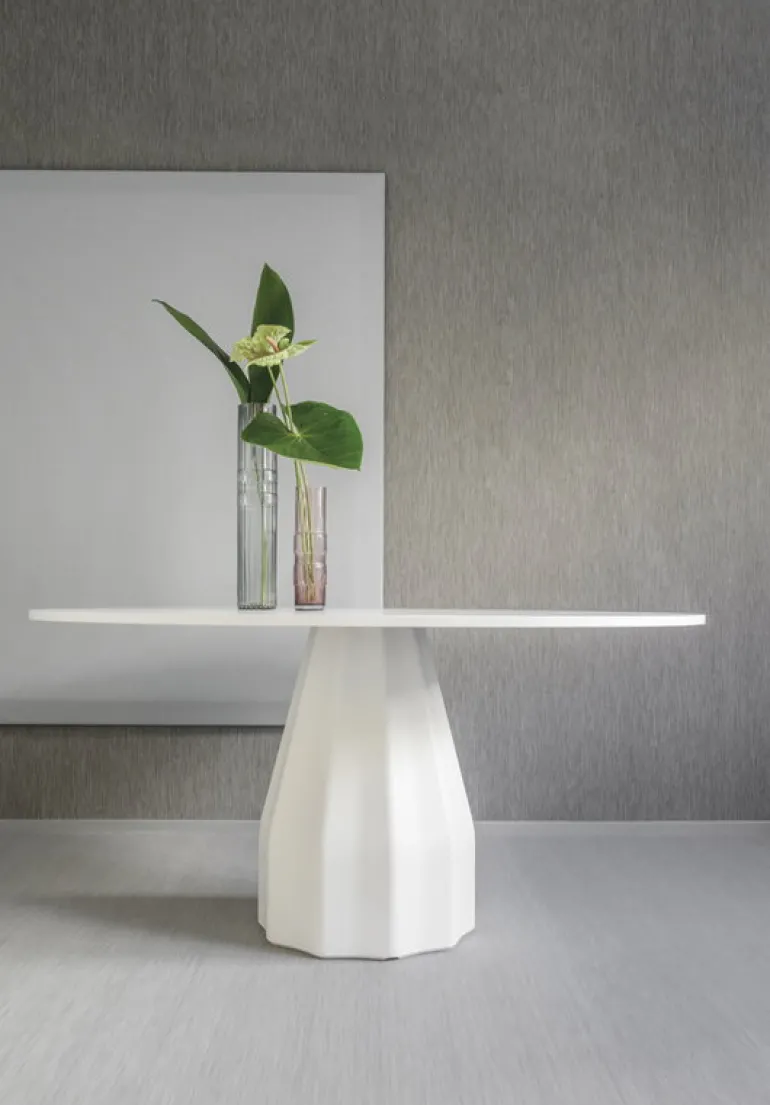 Viccarbe’s Burin table is a sculptural, distinctive piece of furniture designed by Patricia Urquiola. The most recognizable element of the Burin table is its sturdy, polygonal central base. Made from weatherproof compact laminate, the thin tabletop balances the appearance of the bold base, making Burin a perfect dining table for many types of interiors and styles – indoors or outdoors. The Burin series, released in 2011, was inspired by traditional woodcarving methods as well as Spanish design traditions.