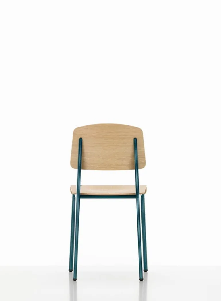 The grayish blue hue of the chair’s frame is part of Jean Prouvé’s original color chart, which he developed himself, and it is called Bleu Dynastie. With its pleasantly shaped seat and backrest in oak plywood, the Standard Chair makes an excellent dining chair, and its design matches perfectly with Vitra’s EM Table, which was also designed by Prouvé.
