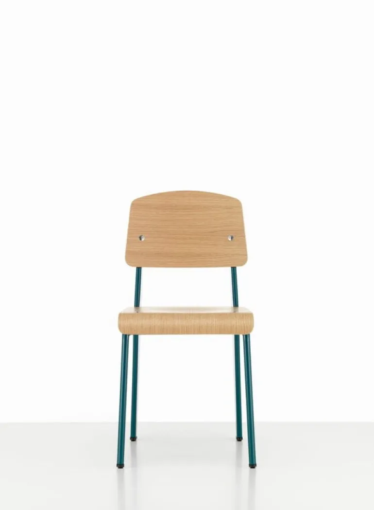 Vitra’s Standard Chair, designed by Jean Prouvé in 1934, has a unique metal structure inspired by Prouvé’s engineering background. Because most of the weight is carried by the chair’s back legs, Prouvé decided to place large, hollow steel legs on the back and slim ones on the front.