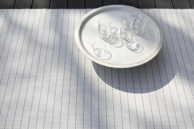 The Line In-Out rug by Woodnotes is made of moisture- and fade-resistant polypropylene, making it well-suited for kitchens and children’s rooms as well as balconies, patios and other outdoor areas. The Line rug also is also a great and practical outdoor rug for pool areas or beach houses, as polypropylene fibers defy chlorine and saltwater.