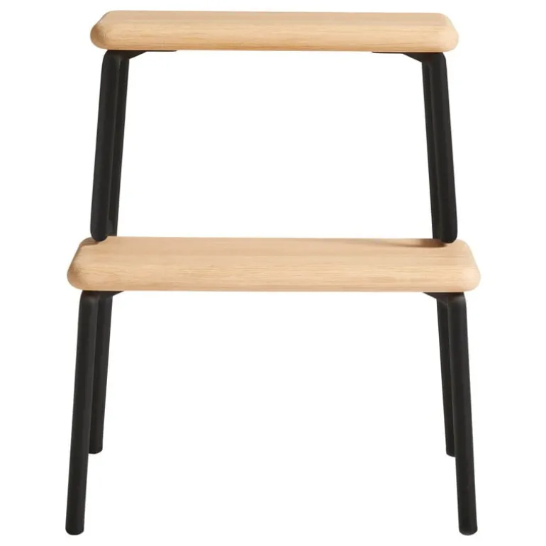 Woud’s Slalom step stool playfully combines a winding, black steel frame with sturdy steps made of white-lacquered oak. This easily movable, multifunctional stool is perfect as a reaching aid in the kitchen, a minimalist nightstand table in the bedroom, or as a plant stand in a living area.