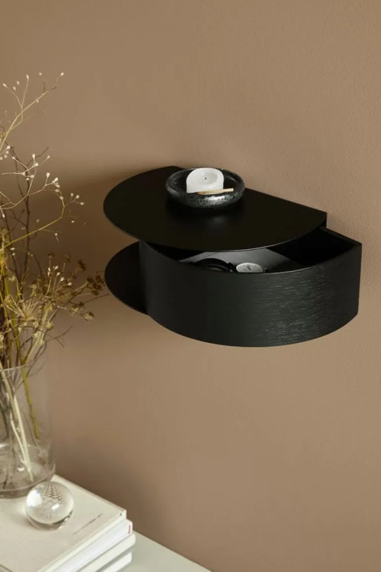 Woud’s Wallie is a versatile wall-mounted drawer designed by Amalie Skov Rahbæk. Wallie can be used for storing all kinds of small items from jewelry and cosmetics to kitchen and office utensils. Wallie’s wooden drawer is attached to the metal bracket by a magnet, allowing the drawer to be moved freely to different directions. The black, metallic bracket also functions as a wall shelf for flowers or decorative items.