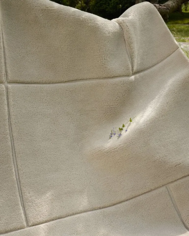 Woven Works’ Line 01 rug delights with the softness of high-pile wool and the simplicity of geometric lines. The off-white shaggy wool rug is divided into sections formed by grooved lines, giving the rug an interesting three-dimensional expression. The design is perfected with braided fringes on the corners.